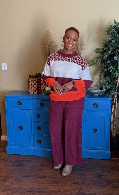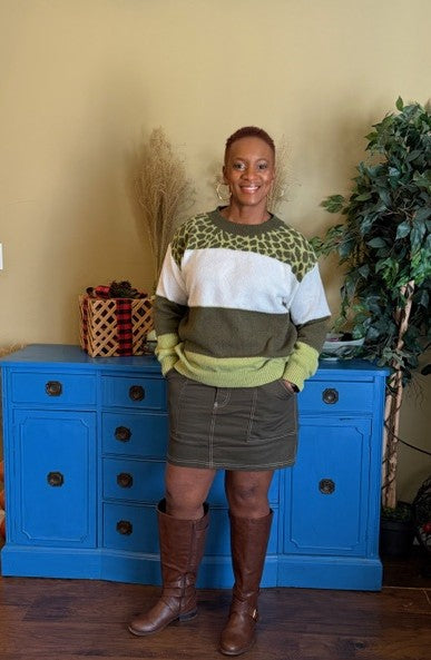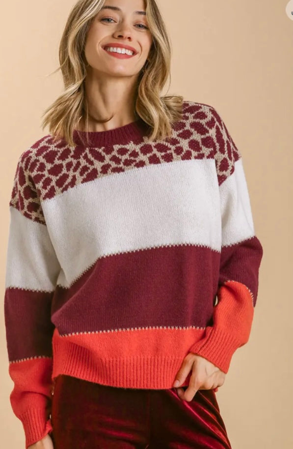Animal Print Detail with Color Block Mock Neck Knitted Pullover Sweater