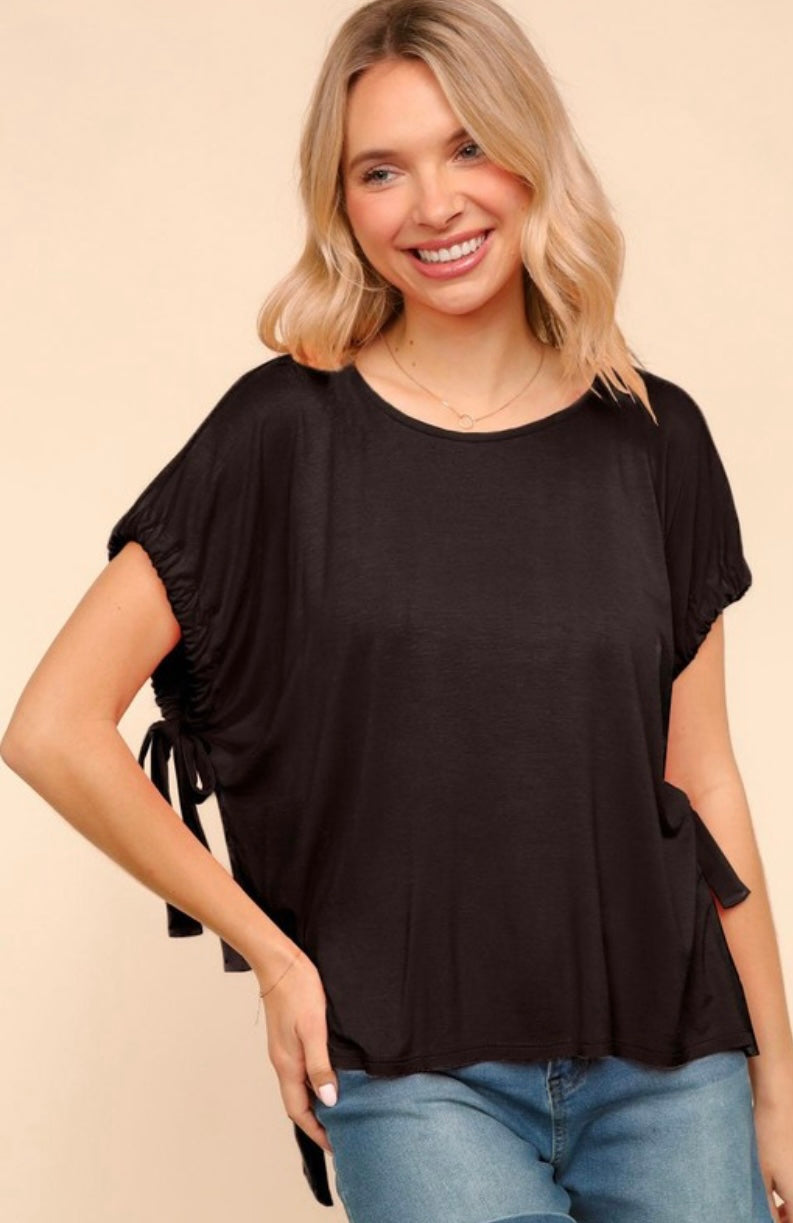 PLUS SIZE ROUND NECK DOLMAN SHORT SLEEVE WITH RIBBON BOW HIGH LOW SOLID KNIT TOP