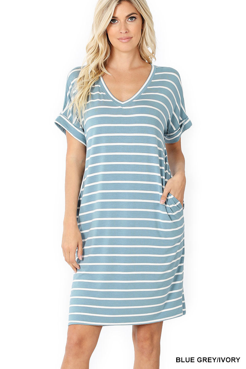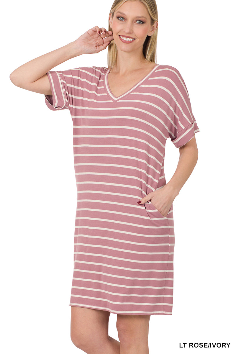 PLUS STRIPE ROLLED SHORT SLEEVE V-NECK DRESS