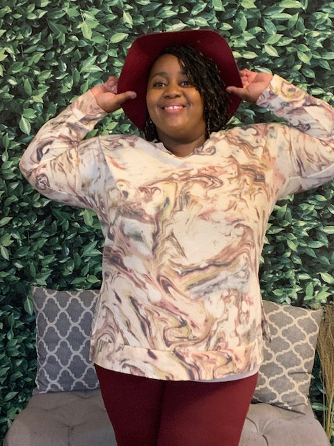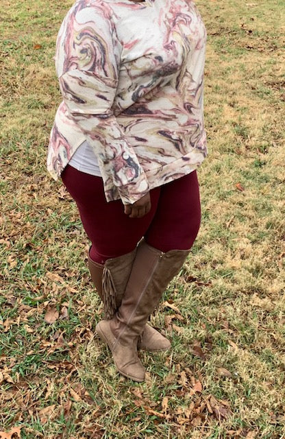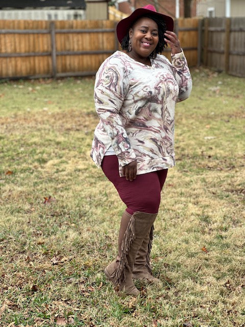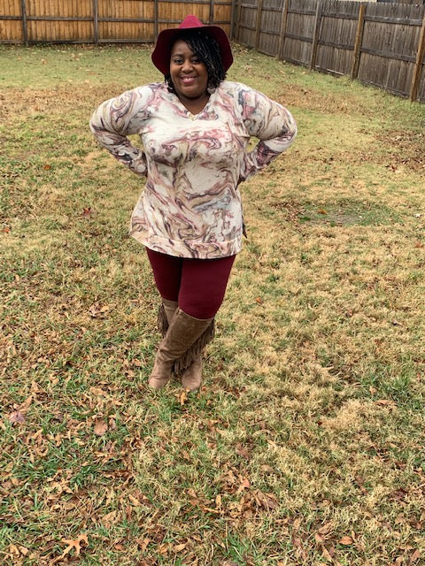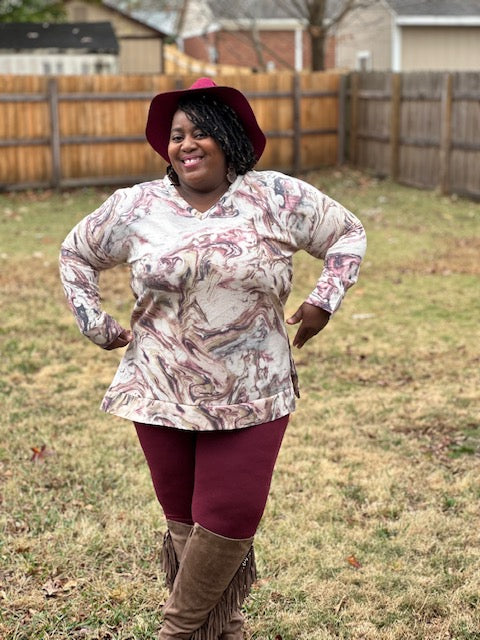 Top-PLUS JACQUARD MARBLE PRINT LONG SLEEVE V-NECK TOP
