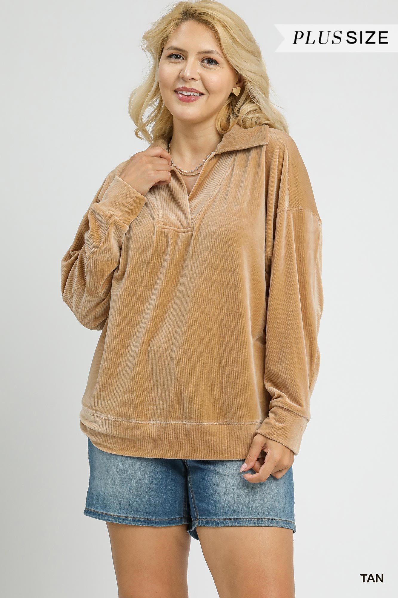 • charcoal-Half-zip front with collar •Tan- Pullover top with V-neck