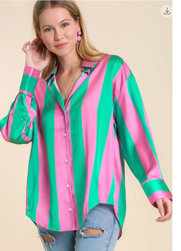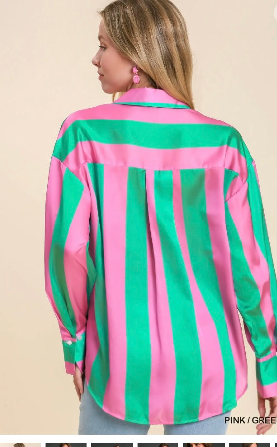 Satin Vertical Striped Button Up Long Sleeve Shirt with Double Button Detail on Cuffs